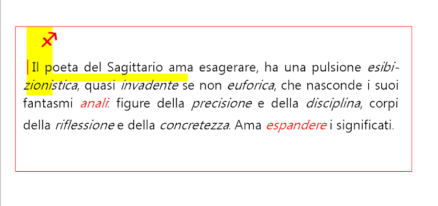 │Il poeta del Sagittario ama esagerare, ha una pulsione esibizionistica, quasi invadente se non euforica, che nasconde i suoi fantasmi anali: figure della precisione e della disciplina, corpi della riflessione e della concretezza. Ama espandere i significati.